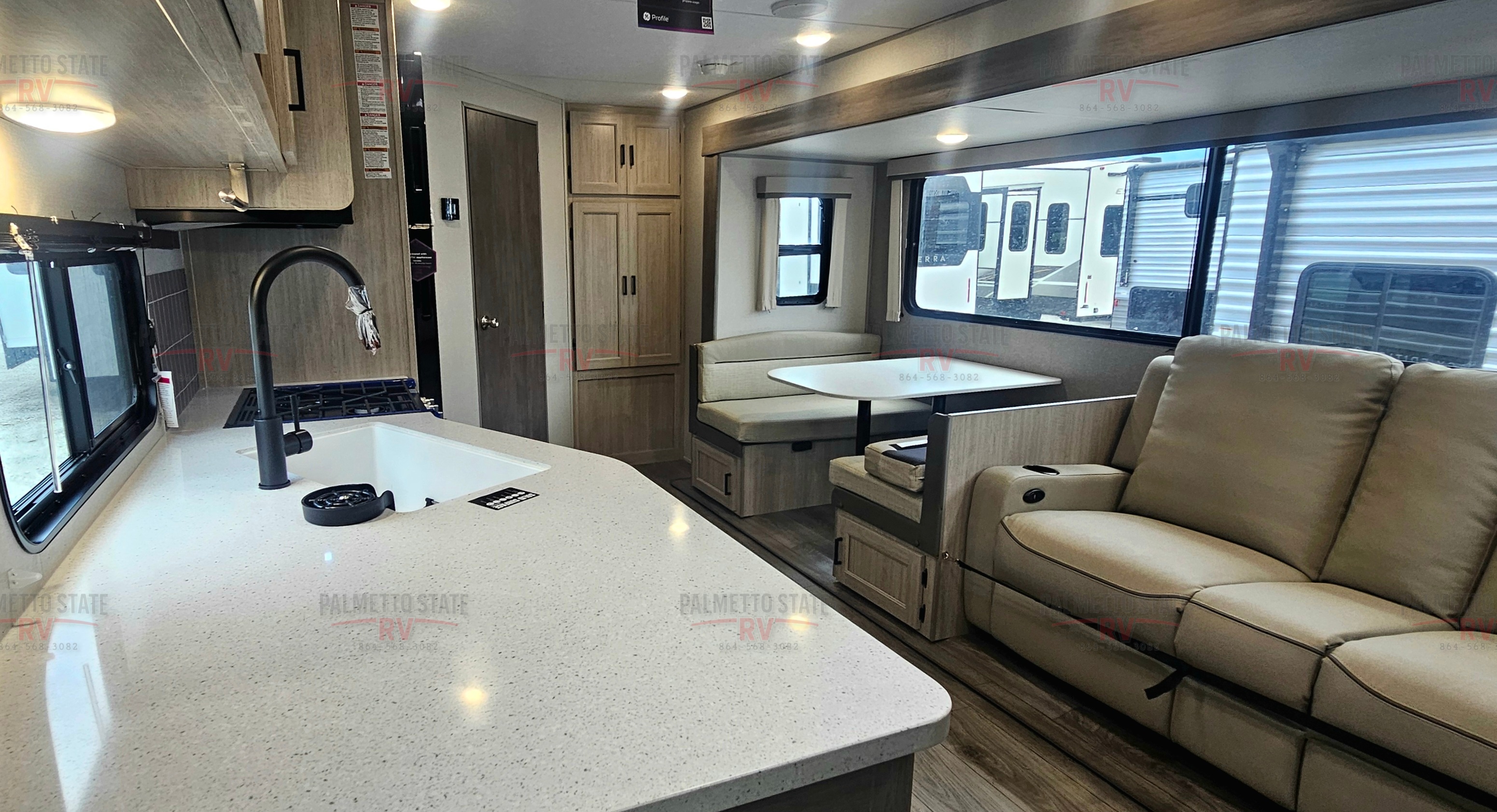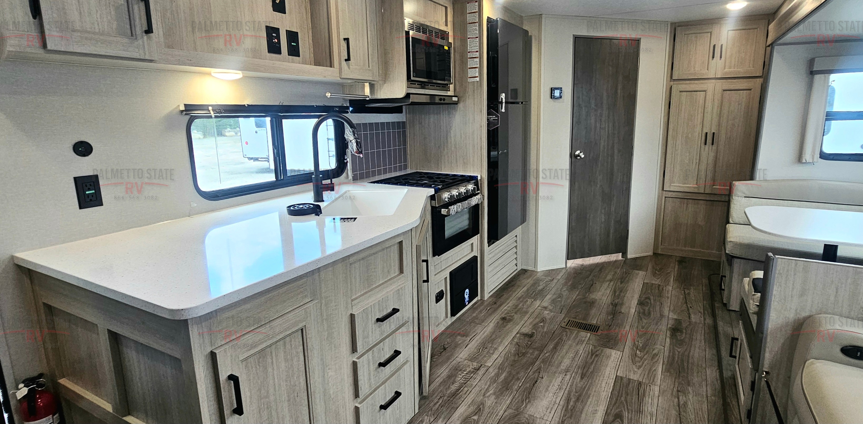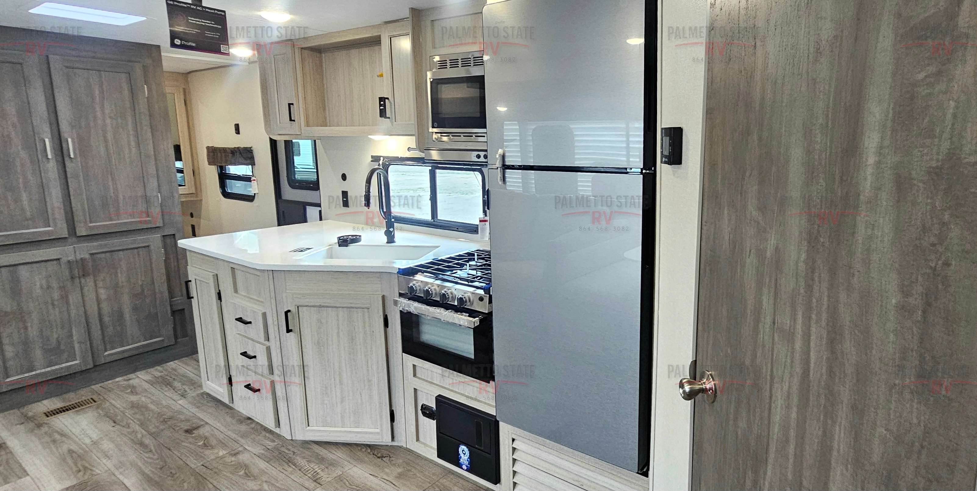 SOLID SURFACE KITCHEN COUNTERTOPS, GE 60K BTU TANKLESS WATER HEATER, STAINLESS GLASS 12V 10 CU FT REFER, STAINLESS MICROWAVE, STAINLESS 3-BURNER GAS RANGE WITH METAL BACK-LIT KNOBS,15K BTU DUCTED GE A/C W/HEAT PUMP IPO 13.5 BTU A/C, DEEP BASIN FARM STYLE SINK, STAINLESS STEEL DRYING RACK, GLASS RINSER, BRICK BACKSPLASH, (2) USB AND (2) 110 OUTLETS