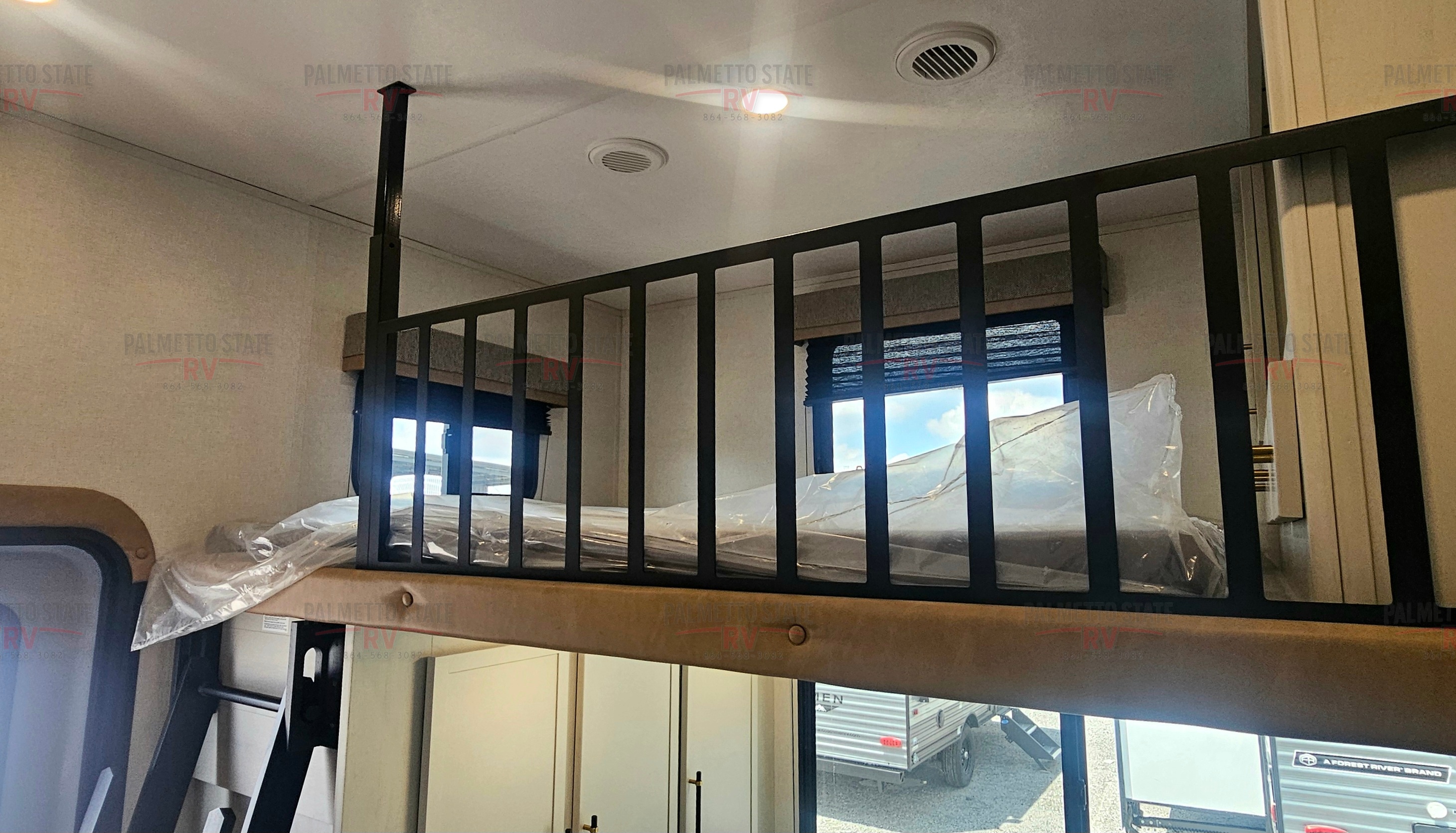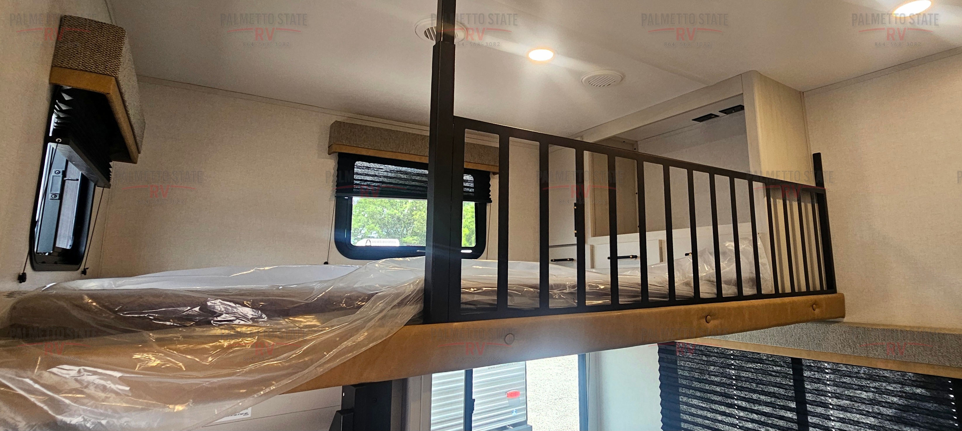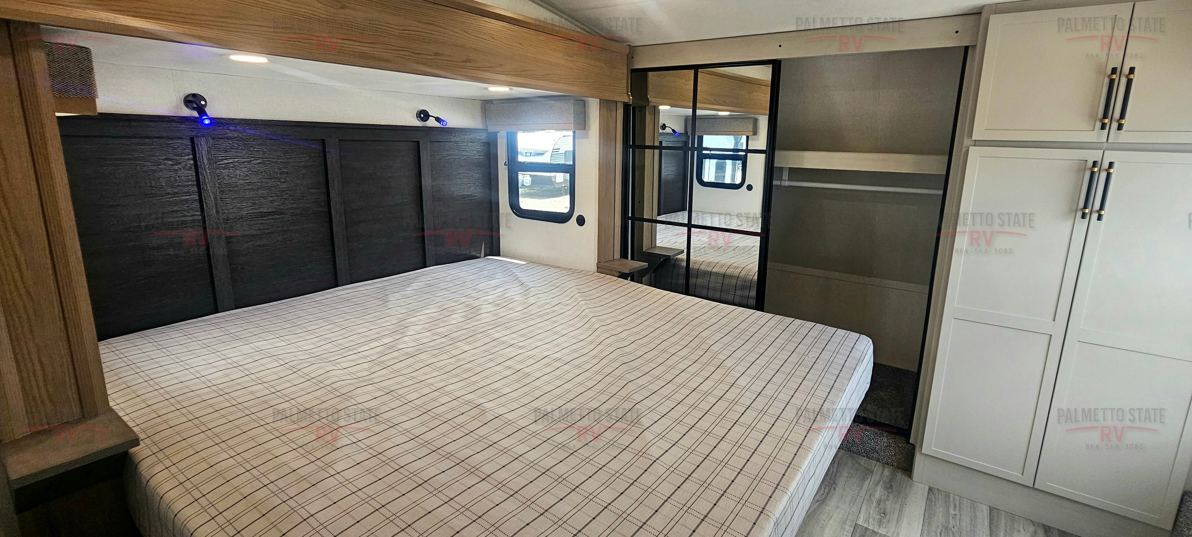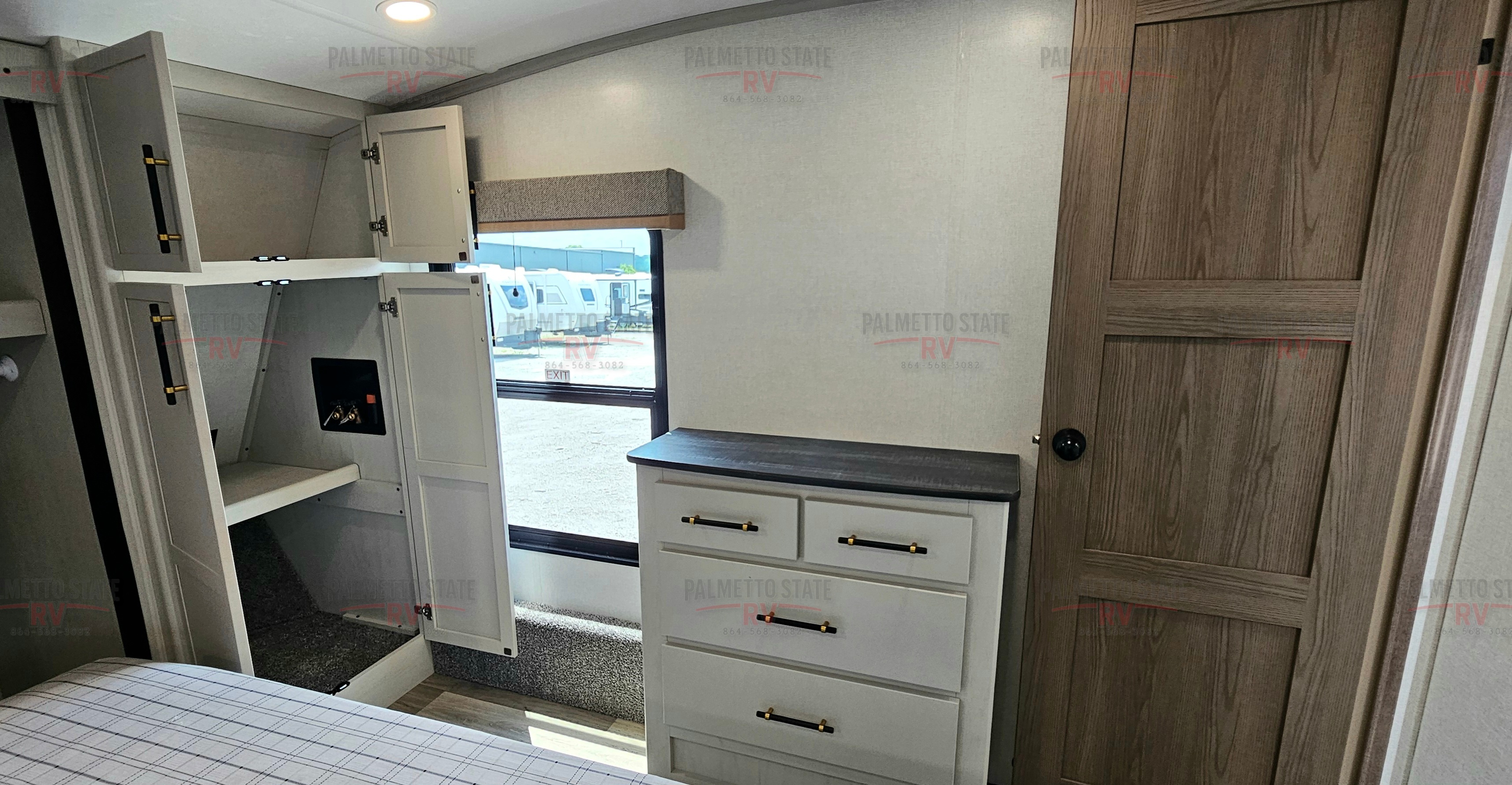 This 40ft. bunkhouse style fifth wheel offers the ability to sleep 6-8 comfortably, while still having the living space to enjoy one another. It has plenty of inside, as well as, outside storage for all of you camping needs. This floorplan has the bath and half option as well as 2 door entries into the unit.