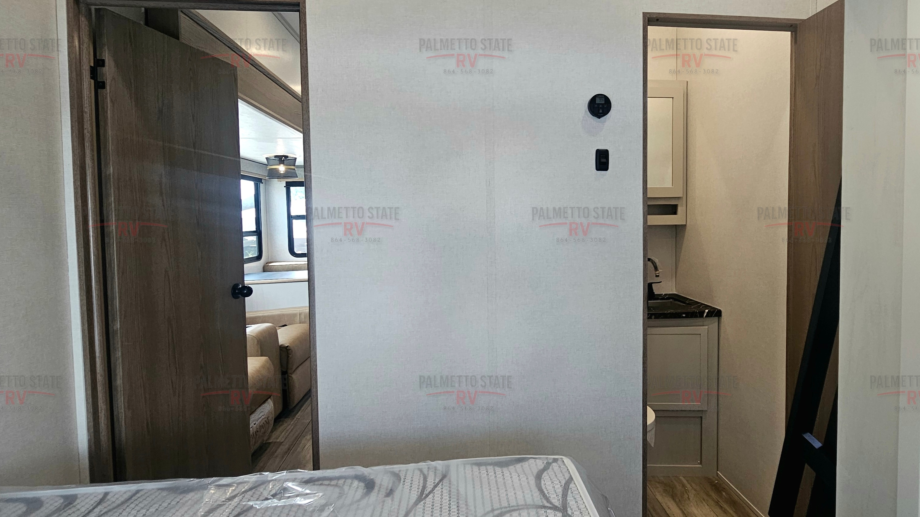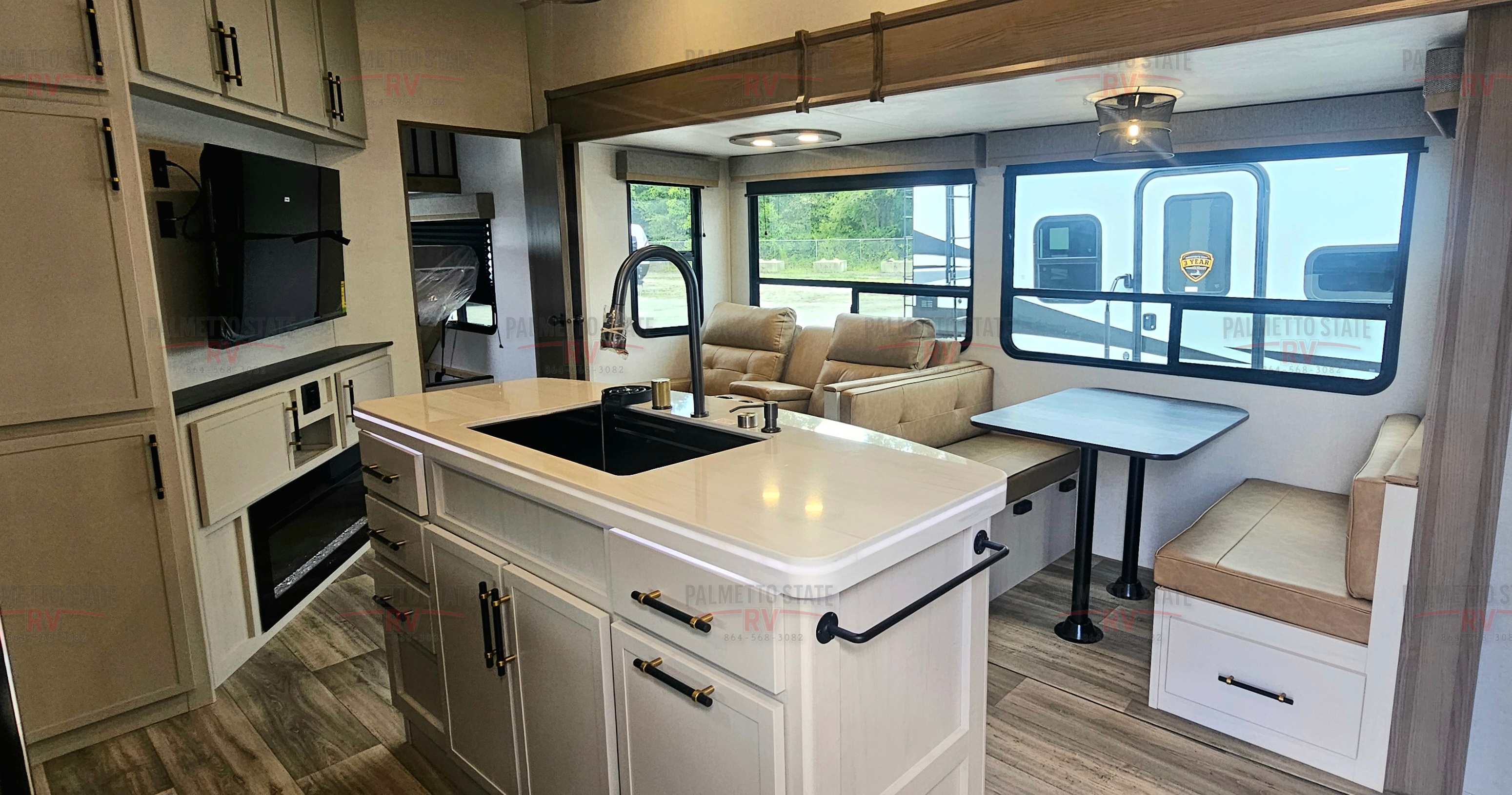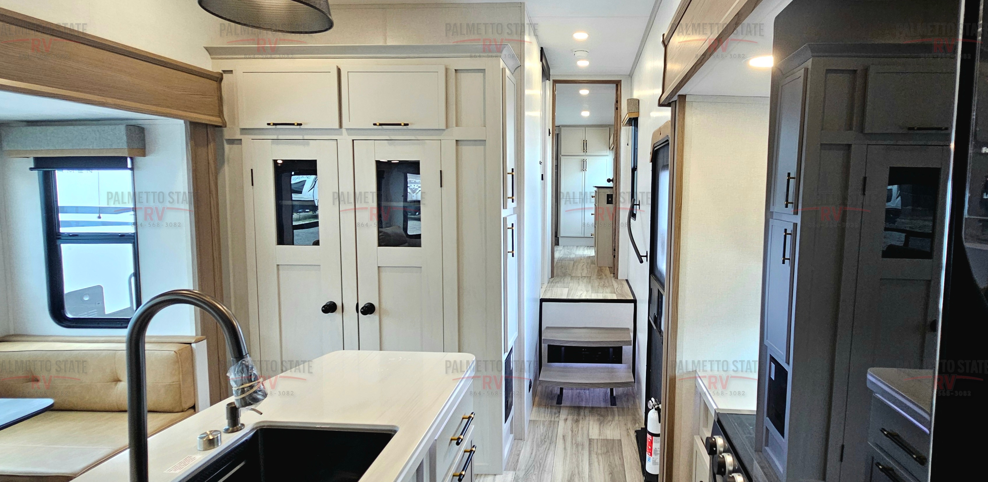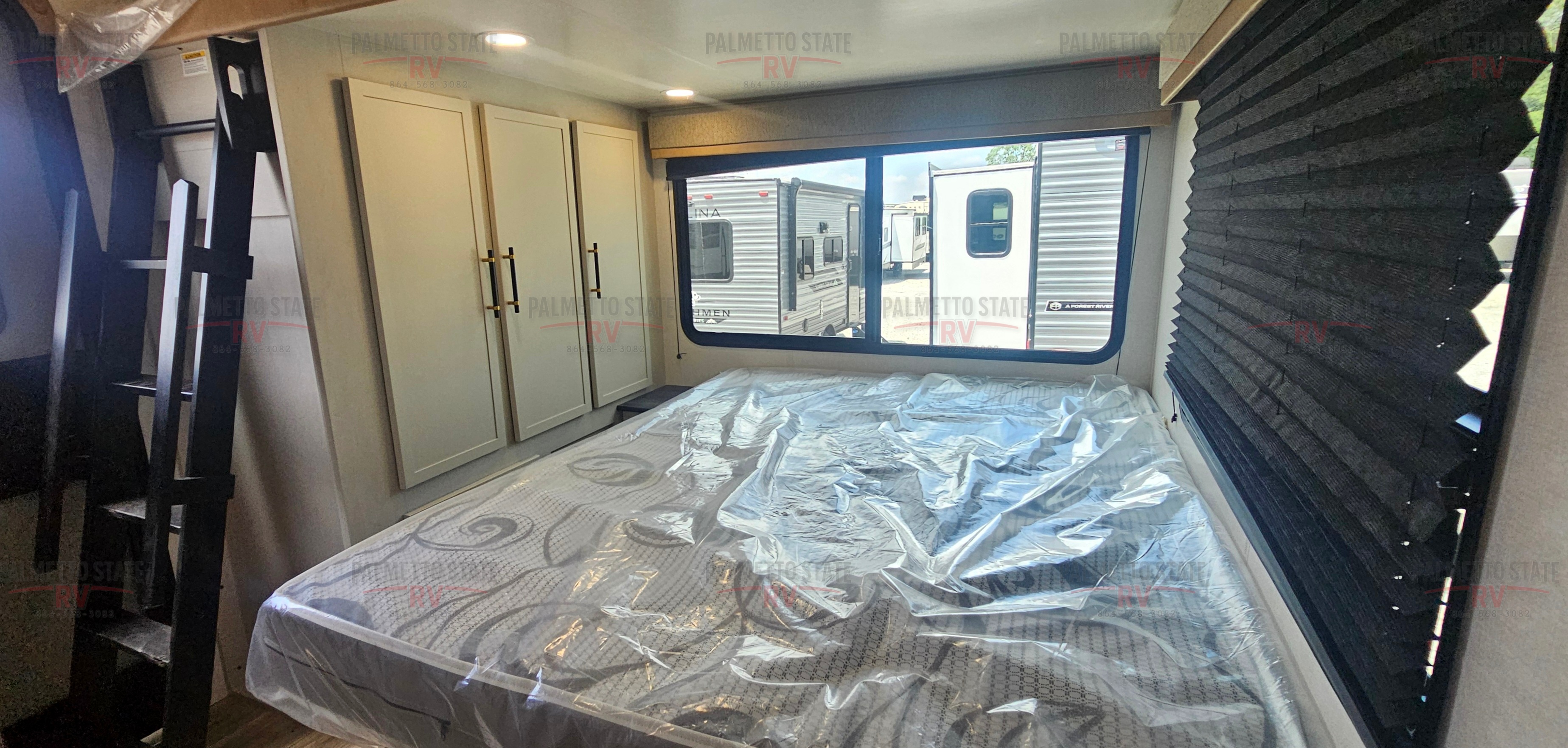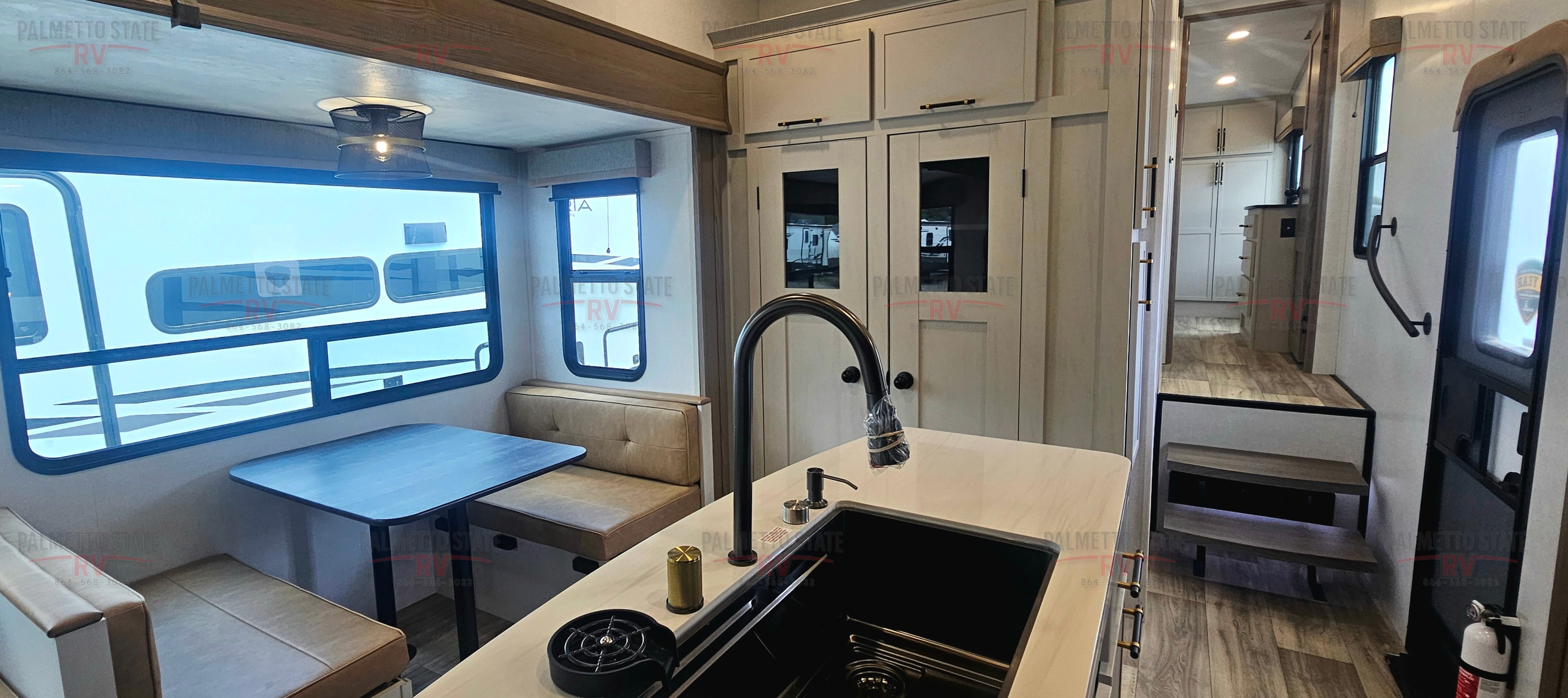 This 40ft. bunkhouse style fifth wheel offers the ability to sleep 6-8 comfortably, while still having the living space to enjoy one another. It has plenty of inside, as well as, outside storage for all of you camping needs. This floorplan has the bath and half option as well as 2 door entries into the unit.