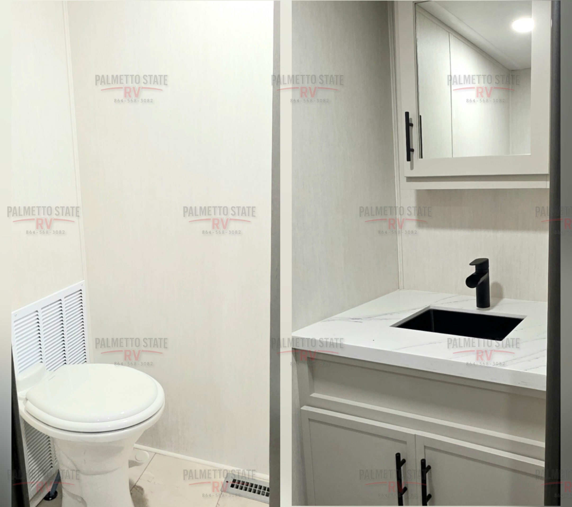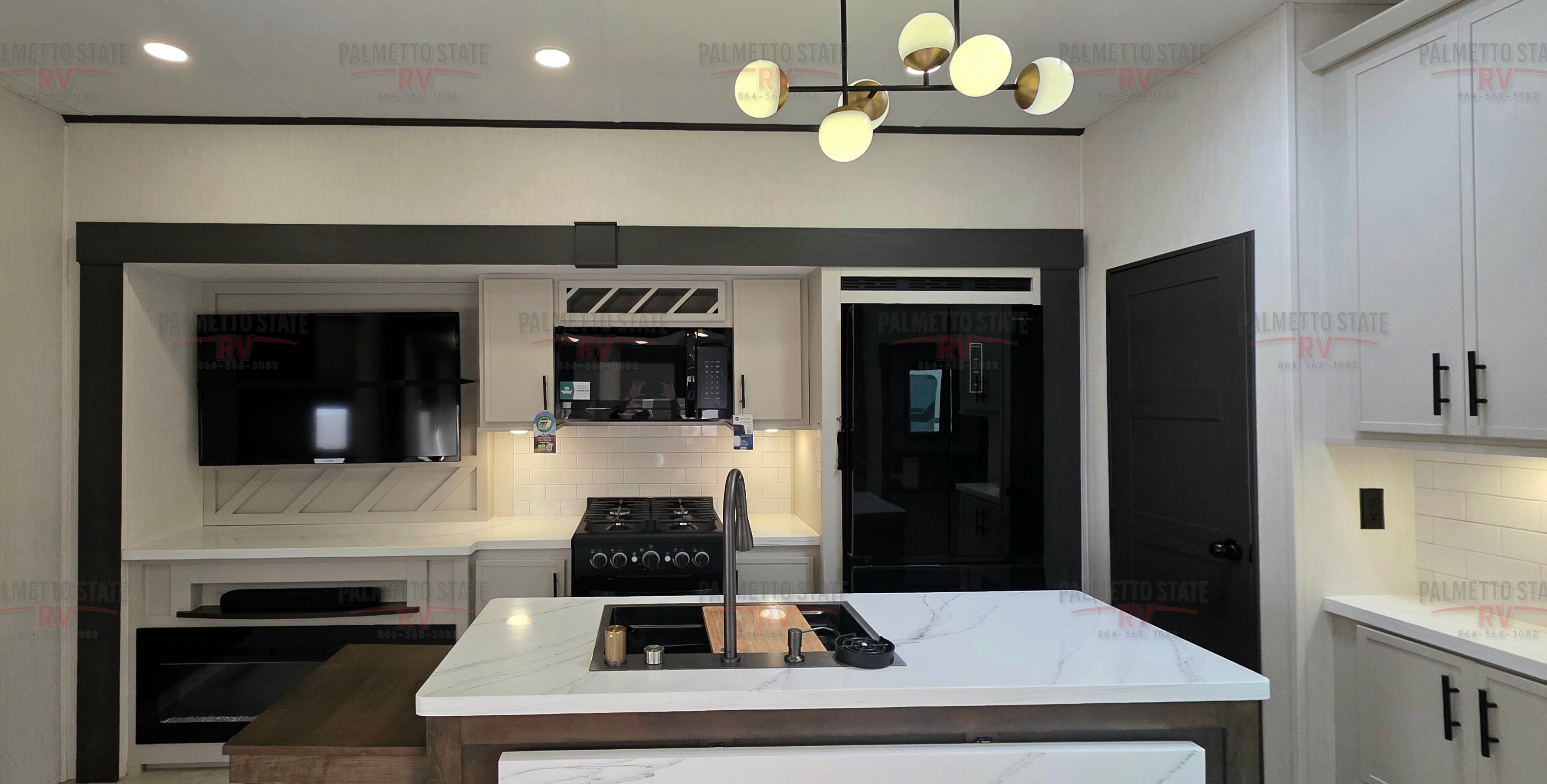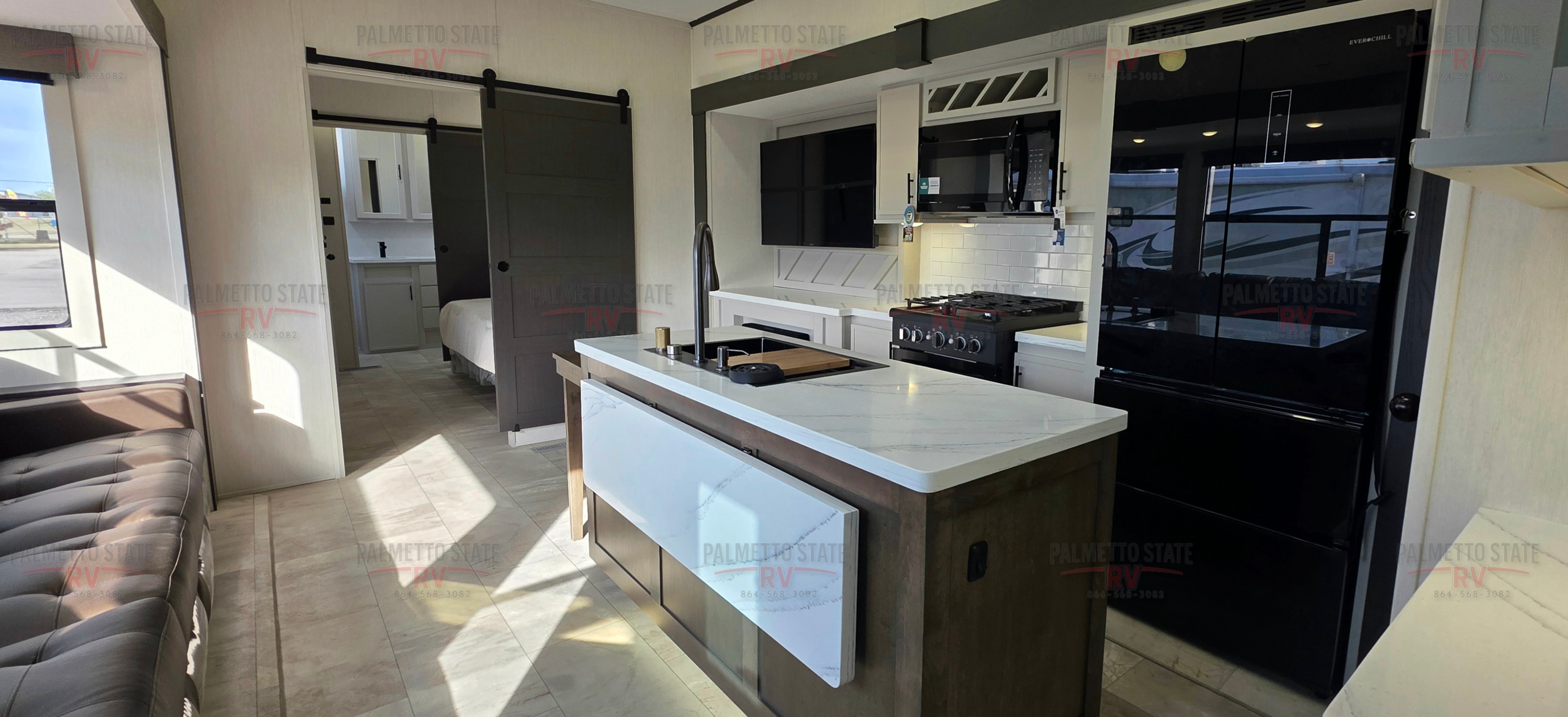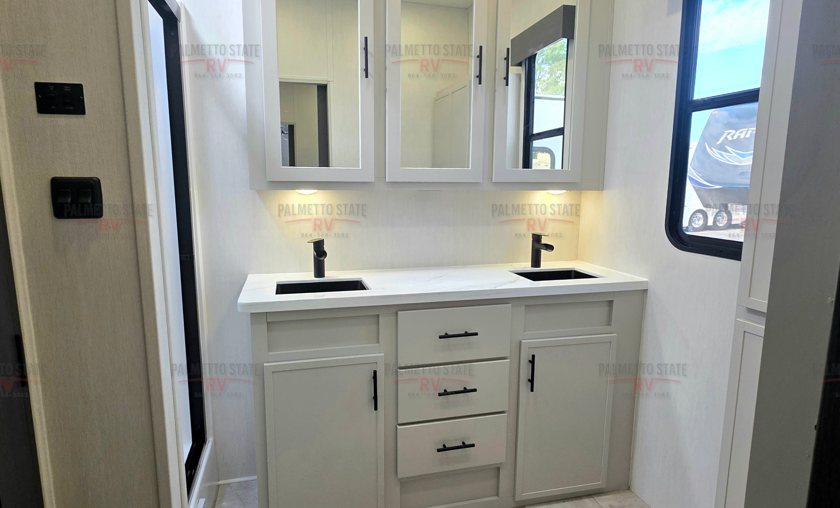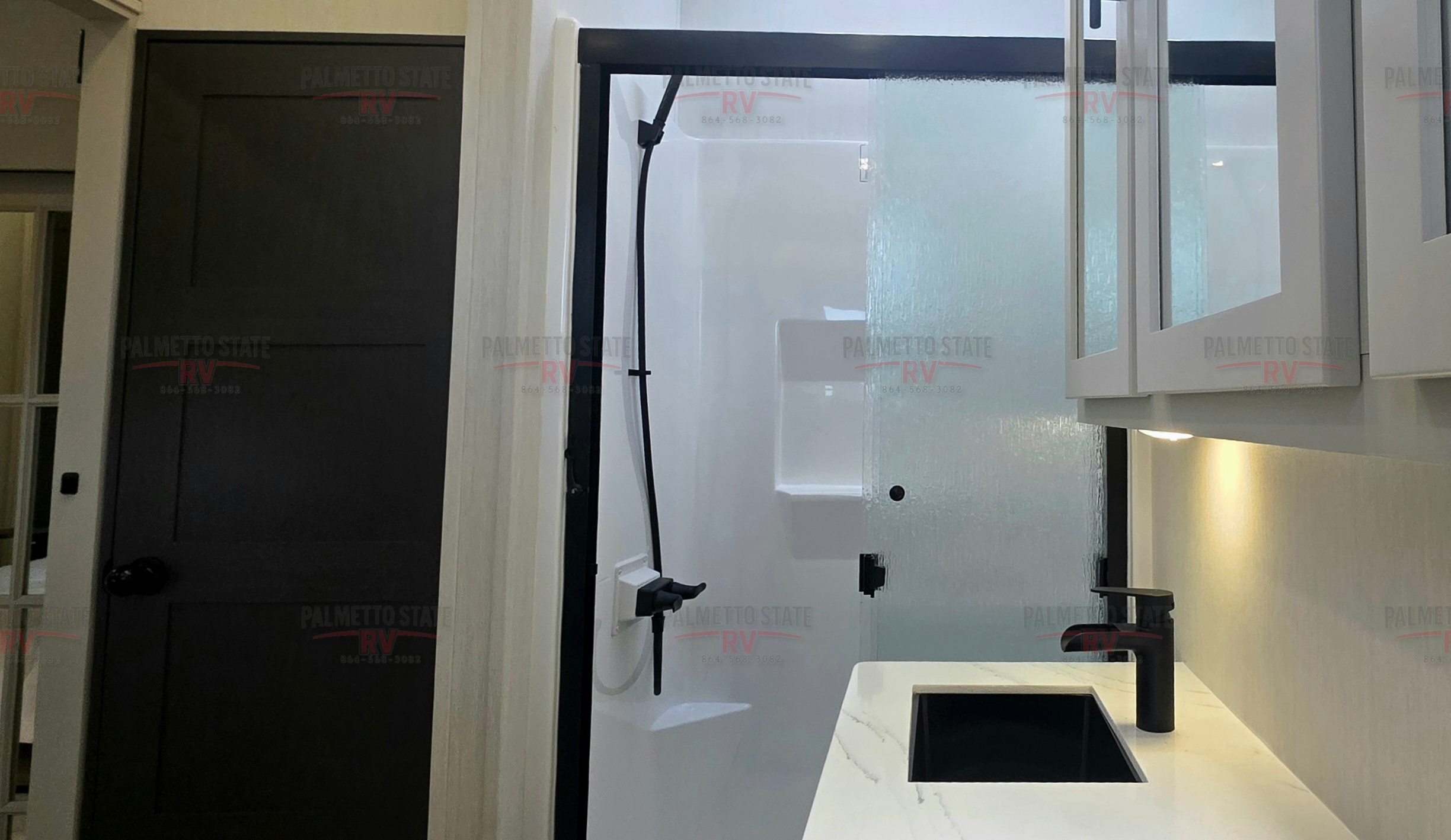 • Heat Rated Solid Surface Countertops Throughout the Coach