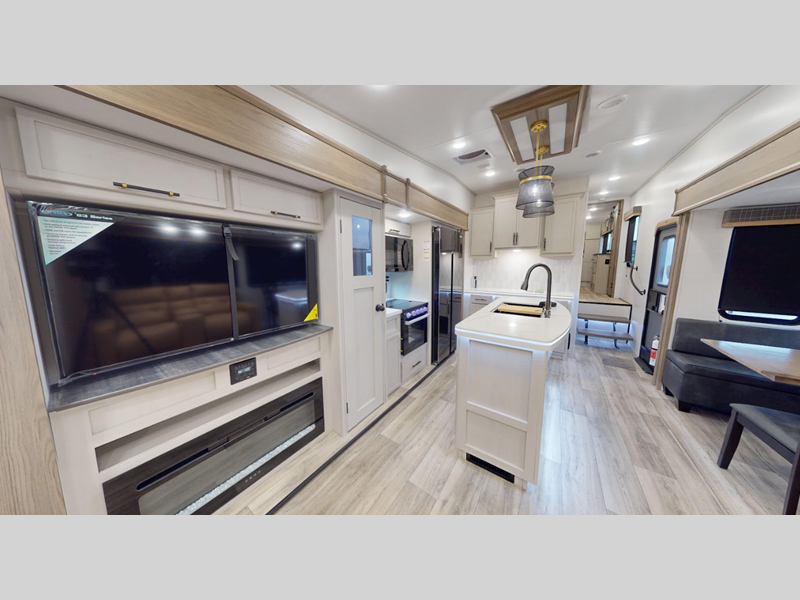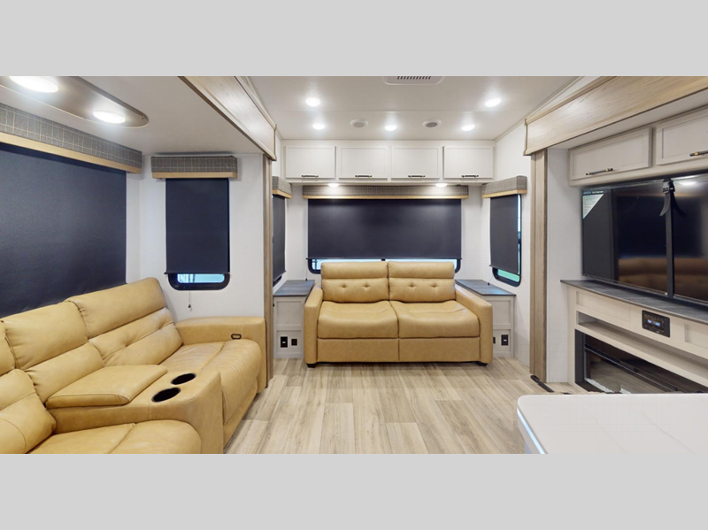 Sleeps 4 Slides 3 Length 36 ft 8 in Ext Height 12 ft 9 in Interior Color Bayport, Lexington Hitch Weight 2299 lbs Dry Weight 10375 lbs Cargo Capacity 1625 lbs Fresh Water Capacity 44 gals Grey Water Capacity 78 gals Black Water Capacity 39 gals Furnace BTU 30000 btu Available Beds King Refrigerator Type 12V Refrigerator Size 16 cu ft Cooktop Burners 3 Number of Awnings 2 LP Tank Capacity 30 lbs Water Heater Type On Demand Tankless TV Info LR HD LED TV, BR HD LED TV Awning Info 11' and 13' Power with LED Lights Axle Count 2 Washer/Dryer Available Yes Number of LP Tanks 2 Shower Type Walk-In Shower Electrical Service 50 amp Similar Floorplans