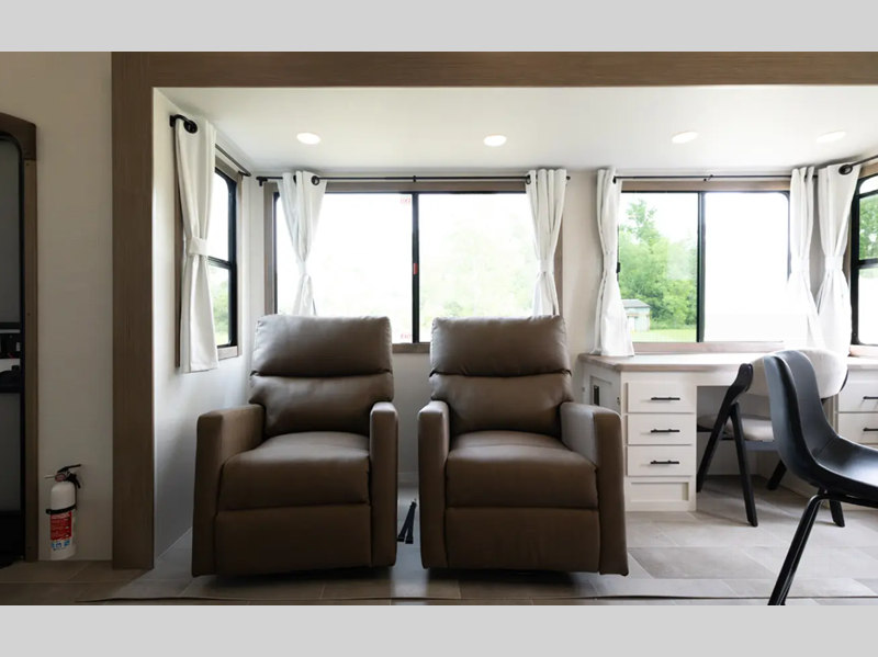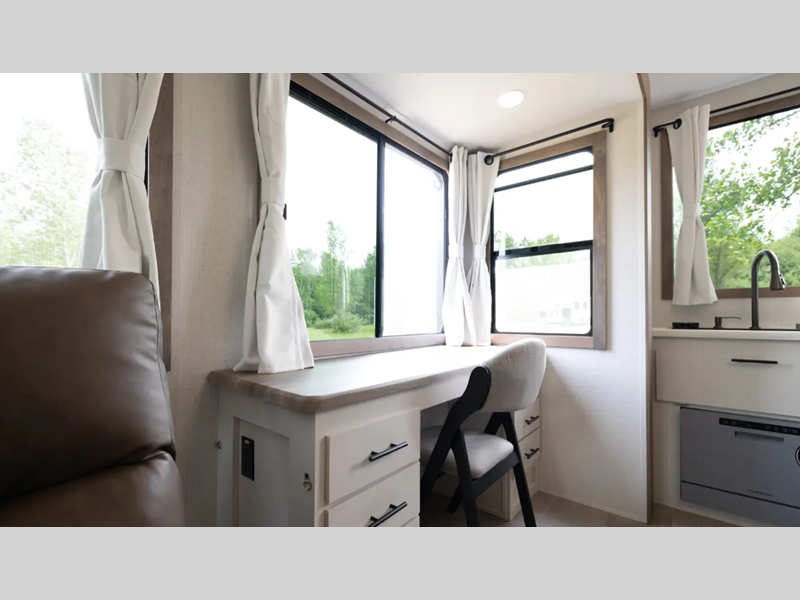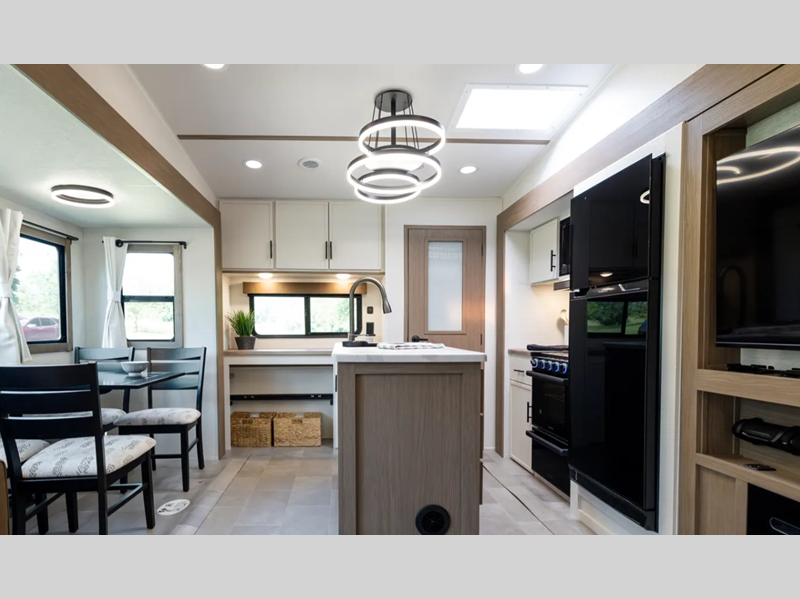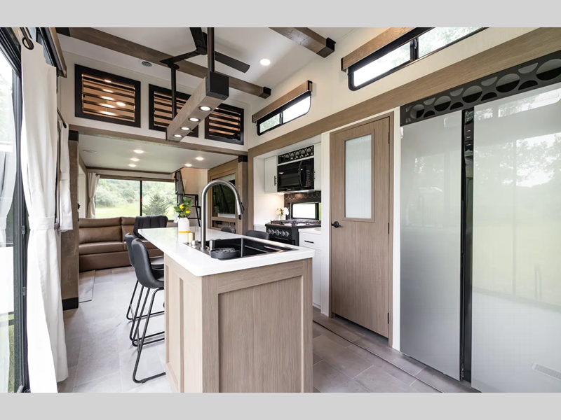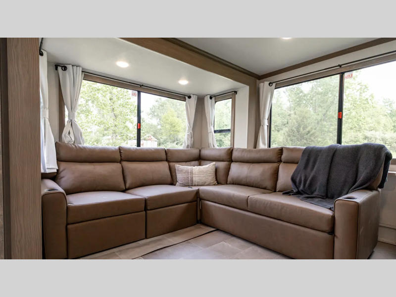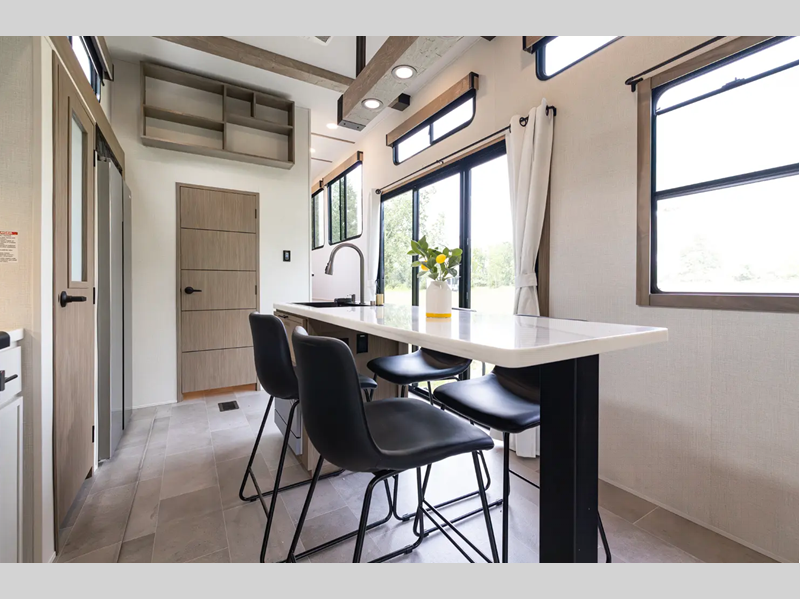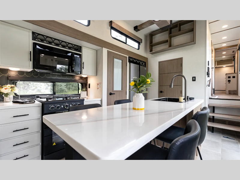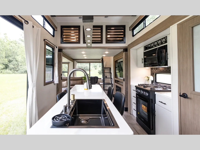 Each fifth wheel is constructed with an vacuum bonded aluminum structure with laminated aluminum sidewalls, slide boxes, a front wall and floor, plus one-piece Tufflex PVC roofing for more strength. The exterior offers a black tank flush, winterization and sanitation an enclosed docking station, and off-grid camping including a solar on the side prep. The interior includes residential linoleum, blackout curtains and roller shades, residential backsplash, and oversized opening windows for great views and circulation of natural air.