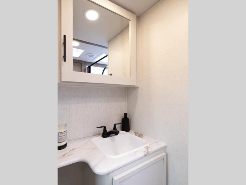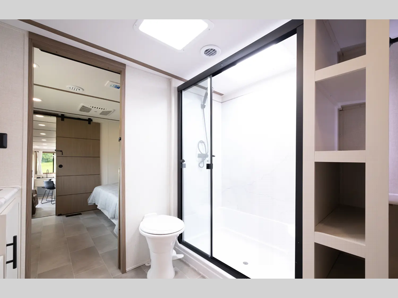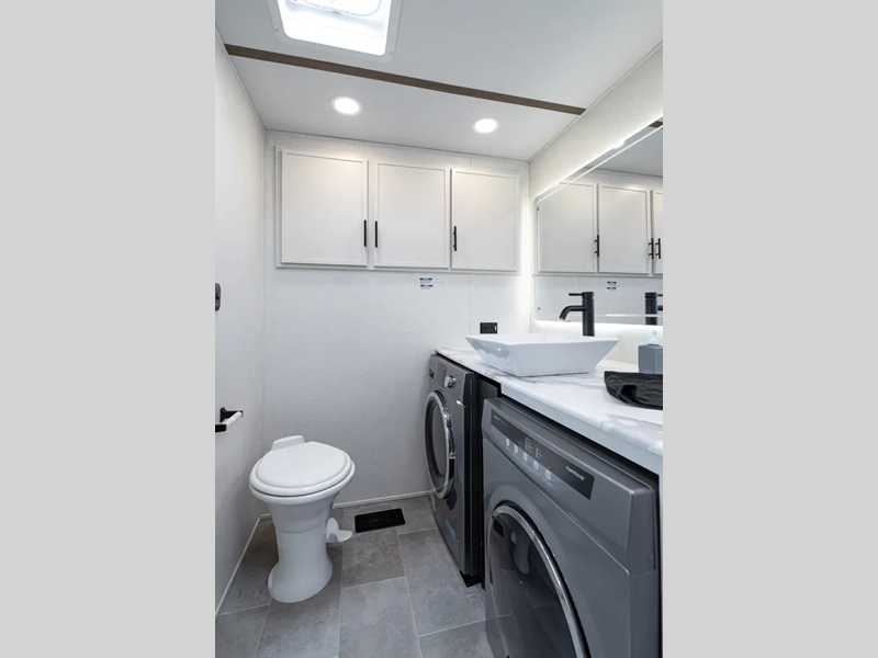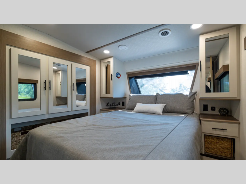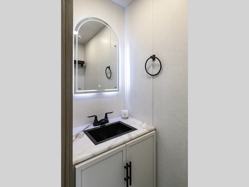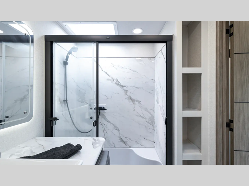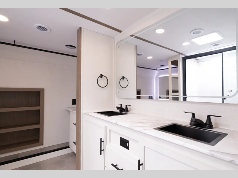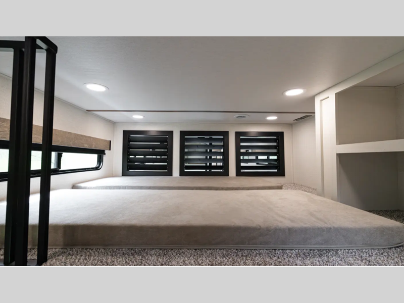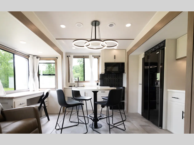 Each fifth wheel is constructed with an vacuum bonded aluminum structure with laminated aluminum sidewalls, slide boxes, a front wall and floor, plus one-piece Tufflex PVC roofing for more strength. The exterior offers a black tank flush, winterization and sanitation an enclosed docking station, and off-grid camping including a solar on the side prep. The interior includes residential linoleum, blackout curtains and roller shades, residential backsplash, and oversized opening windows for great views and circulation of natural air.