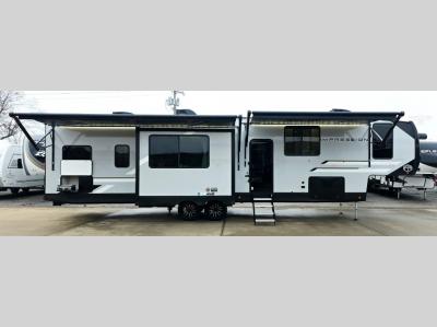 Sleeps 5 Slides 3 Length 41 ft 10 in Ext Width 8 ft Ext Height 13 ft 1 in Hitch Weight 2325 lbs Dry Weight 11628 lbs Cargo Capacity 2697 lbs Fresh Water Capacity 57 gals Grey Water Capacity 60 gals Black Water Capacity 30 gals Furnace BTU 35000 btu Available Beds King with Versa Tilt Refrigerator Type 12V Refrigerator Size 16 cu ft Cooktop Burners 3 Number of Awnings 2 Water Heater Type On Demand AC BTU 15000 btu TV Info LR LED RV Awning Info 14' & 20' Adjustable Power Awning with LED Lights Axle Count 2 Washer/Dryer Available Yes Shower Type Walk-In Shower Electrical Service 50 amp Similar Fifth Wheel Floorplans